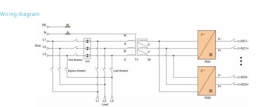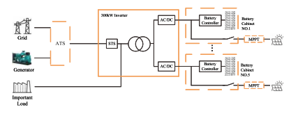 Besonderheit Das System nutzt modulare Wechselrichtereinheiten in Parallelkonfiguration Der DC-Eingang jedes Wechselrichtermoduls entspricht einem eigenen Batterieschrank. Ermöglicht die Verwaltung pro Cluster, um zirkulierende Ströme zwischen ihnen zu eliminieren Batteriestränge. Die AC/DC-Leistungsmodule unterstützen einen flexiblen Einsatz sowohl in der Menge als auch in der Menge Nennleistung mit einer maximalen Kapazität von 60-kW-Modulen in einer Parallelschaltung mit 5 Einheiten Konfiguration. Der Wechselstromausgang der Leistungsmodule wird über einen Transformator geliefert Isolierte Ausgangsstufe, die die Last mit starkem Widerstand mit Strom versorgt aktueller Schock. Das Hybrid-ESS nutzt eine gleichstromgekoppelte Photovoltaik-Integration und erreicht so eine hohe Leistung Energieumwandlungseffizienz und optimiert für Off-Grid-Szenarien mit PV Erzeugungskapazität übersteigt Lastbedarf; Für den Außenbereich geeignete MPPT-Controller Integrieren Sie Combiner- und MPPT-Funktionen in einem einzigen gehärteten Gehäuse. Das Komplettsystem umfasst einen optionalen Dieselgenerator (ATS) und einen 300-kW-Hybrid Wechselrichter, PV-MPPT-Regler und ein Batterie-Energiespeichersystem.